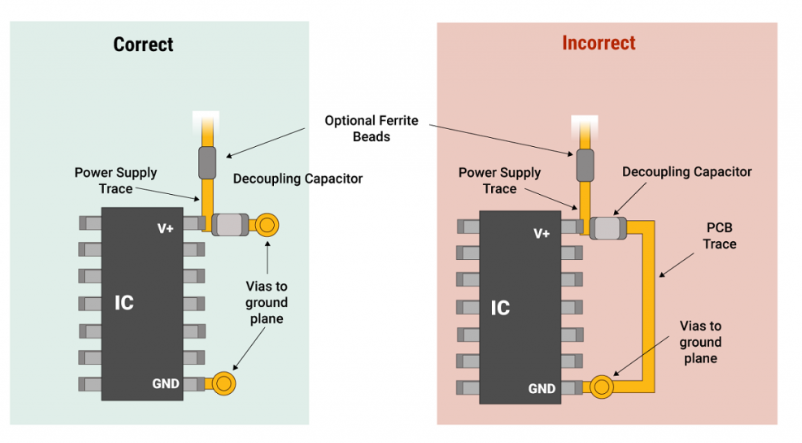 - Close to Power Pins: Place decoupling capacitors as close as possible to the IC’s power pins to minimize parasitic inductance.