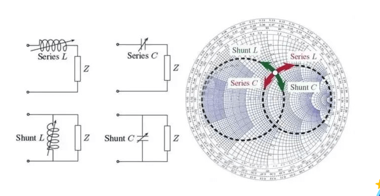 When a variable inductor/capacitor is connected in series or in parallel before the load, the circuit diagram is shown in the 4 figures on the left of the figure below, and several curves on the right side of the Smith chart will be obtained.