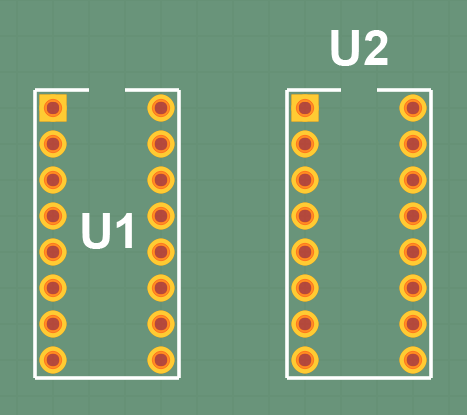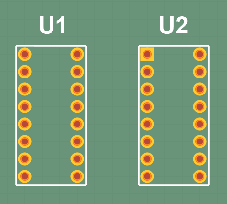 Integrated circuits should have a clear indicator, such as a dot or star, next to pin 1 to ensure the IC is installed correctly. Improperly installed ICs can be damaged or destroyed. When the IC is on the PCB, debugging is easier if the pin 1 indicator is not buried underneath the IC. In the image below, U1 will be difficult to place correctly. Notice that the pin numbers you see in the image do not appear on the PCB. U2 will be placed correctly because pin 1 is clearly marked (square pin).