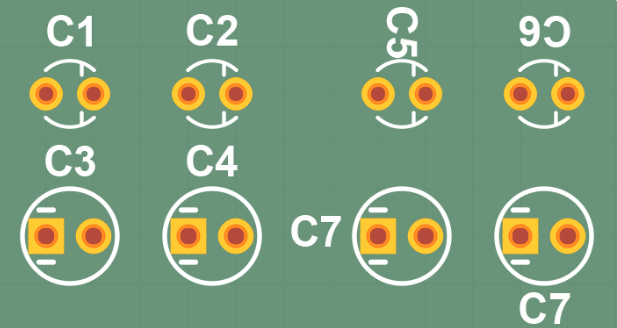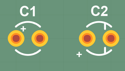 Some two-terminal components, such as LEDs and electrolytic capacitors, are polarized. Improperly installing polarized components can cause circuit malfunction or component damage. LEDs only illuminate when installed correctly. If installed upside down, the LED will not conduct and may even be damaged by voltage breakdown. Electrolytic capacitors can explode if reverse biased. Use footprints to indicate polarity. Polarity markings should not be buried under components. In the image below, the footprint of C1 is poor because the polarity marking is covered by the component. The footprint of C2 is good because the polarity marking is visible when the capacitor is on the PCB.