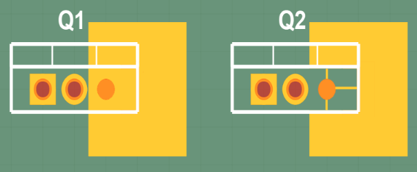 Using heatsinks on component pins makes soldering easier. You might not want to use heatsinks to reduce electrical resistance and thermal impedance, but not using them can make soldering very difficult, especially when component pads are connected to large traces or copper fill. Without proper heatsinking, large traces and copper fill act as heat sinks, making heating the pad difficult. In the image below, Q1’s source pin has no heatsink. This MOSFET can be difficult to solder and desolder. Q2’s source pin has a heatsink. This MOSFET is easy to solder and desolder. PCB designers can change the amount of heatsinking to control the electrical resistance and thermal impedance of the connection. For example,