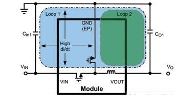 Although these loop areas are basically invisible in the power module, it is still important to understand the current paths of each of the two loops because they extend outside the module. In loop 1 shown in Figure 1, the current self-conducts through the input bypass capacitor (Cin1) during the continuous conduction time of the high-side MOSFET through the MOSFET to the internal inductor and output bypass capacitor (CO1), and finally returns to the input bypass capacitor.