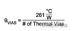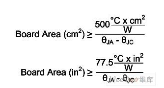 The required PCB board area approximation does not take into account the role played by the vias, which transfer heat from the top metal layer (where the package connects to the PCB) to the bottom metal layer. The bottom layer acts as a second surface layer from which convection can transfer heat away from the board. For the board area approximation to be valid, at least 8 to 10 vias are used. The thermal resistance of the vias is approximated by the following equation.