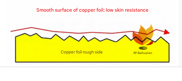 Under high-frequency and high-speed conditions, signal transmission is increasingly concentrated on the “surface” of the conductor, namely the skin effect. When the frequency reaches 1 GHz, the skin depth of the signal on the conductor surface is only 2.10 µm; when the signal transmission frequency is increased to 10 GHz, the skin depth of the signal on the conductor surface is 0.66 µm; and in the millimeter wave frequency band (>30 GHz), the skin depth is further reduced to below 0.40 µm (as shown in Figure 1). If the surface roughness of the conductor is greater than the skin depth, the signal transmission is only carried out within the thickness range of the roughness, making the standing wave and reflection of the transmission signal more and more serious, and causing the signal transmission path to become longer, increasing the transmission loss (as shown in Figure 2). When the surface roughness of the conductor is lower than the skin depth, the signal transmission path is short, reducing the transmission loss (as shown in Figure 3). Therefore, the lower the roughness of the conductor copper foil, the lower the insertion loss (transmission loss) of the produced PCB product.