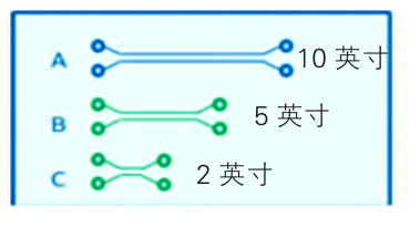 As shown in Figure 12, in order to eliminate test errors and via effects, three transmission lines of different lengths are designed. Generally, the lengths of the transmission lines are designed to be 2 inches (1 inch = 25.4 mm), 5 inches, and 10 inches. Insertion loss is tested by using two groups of adjacent long and short lines. The insertion loss value of the pure line can be obtained by subtracting the two groups of data and dividing by the length difference. The difference between the two groups of insertion loss data can be compared to determine the accuracy of the insertion loss of this test. That is, the insertion loss values of structures A, B, and C are the sum of their respective transmission line insertion loss values and via insertion loss values.