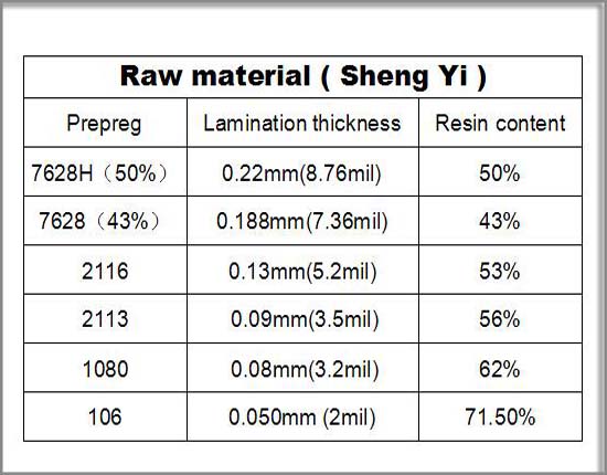 Prepreg thickness of raw material ( ITEQ ShengYi ):