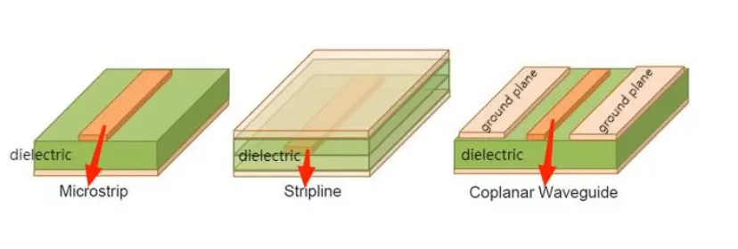 Coplanar waveguide features a signal trace with ground planes on the same layer on both sides. This configuration offers good high-frequency performance and easier integration with surface-mounted components. The impedance depends on: