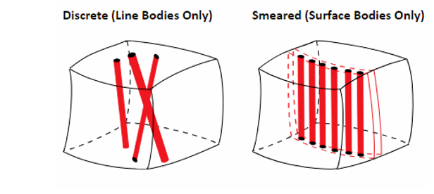 For properly modeled geometries, Mechanical provides the option of specifying reinforcement materials in the structure. Mechanical can model these enhanced geometries using special reinforcement components. These reinforcement components interact with standard structures or thermal wishes through shared nodes to provide additional reinforcement. As shown in the figure, Mechanical provides reinforcement specifications for line bodies (discrete reinforcement materials) and surface bodies (diffuse reinforcement materials). Each line body designated as a reinforcement material basically represents a reinforcement fiber arbitrarily oriented in space. Each surface body designated as a reinforcement material basically represents a reinforcement layer. The reinforcement layer can be a homogeneous reinforcement layer or a reinforcement layer with uniformly spaced fibers.