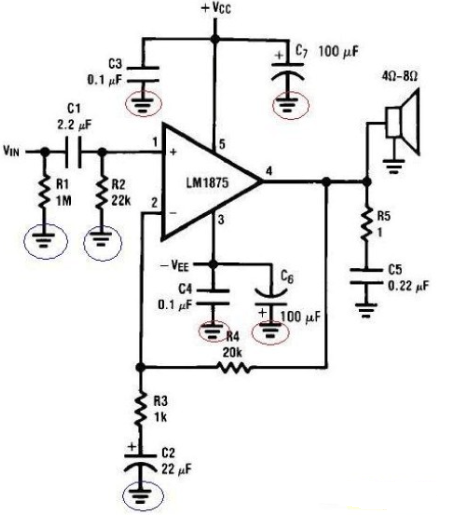 In the figure, R1 and R2 are the input grounding resistors, C2 is the DC feedback capacitor, the grounding point is the small signal ground, marked in blue; C3, C4, C6, and C7 are decoupling capacitors, and the grounding end is marked in red, which is the power ground. . The correct grounding method is: three small signal ground points can be mixed on one ground line, four power grounds are gathered into another ground line, and the power ground and small signal ground converge at the general ground point. In addition to the general ground point, There must be no other connecting points between the two lands!