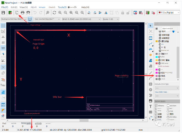 The PCB editor has a precision of 1 nanometer, which is the smallest difference that two positions can have in the X or Y direction. It has an internal (0,0) coordinate system origin, which is the “page origin” – the upper left corner of the page area you see when you open Pcbnew. In the internal coordinate system, X increases from left to right, which is normal, but Y increases from top to bottom, which is different from commonly used CAD (such as AD). This is due to historical reasons. The opposite Y axis coordinate is very annoying for some users, but fortunately it can now be modified through configuration.