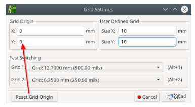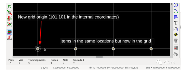 If the user always keeps the same fine-pitch grid, the concept of independent grid origin is not necessarily needed. Suppose a 10x10mm grid is used, and an object is placed at each grid point. By default, the grid starts from the internal 0,0 origin, so there are some grid points at: such as (100,100), (110,100), (120,100).