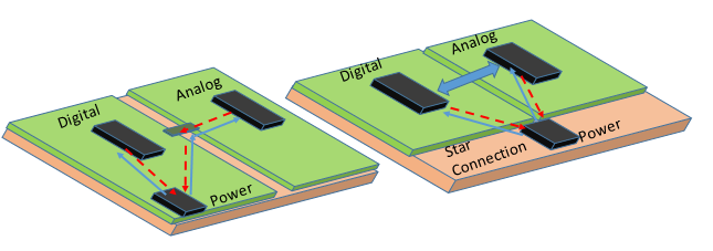 - Mixed-signal designs require separate analog and digital grounds