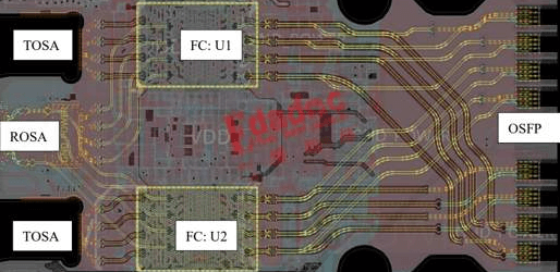 The following is a partial design circuit diagram of one of our 1.6T optical modules. These high-speed signal lines are divided into two parts: one part is from the OSFP gold finger to the middle DSP chip, which consists of 8 pairs of TX and 8 pairs of RX, each pair of 200/224Gbps constitutes the channel for sending and receiving 1.6TE; the other part is from the chip to the TOSA and ROSA interface pads, which is also composed of 8 pairs of TX and 8 pairs of RX, each pair of 200/224Gbps. There are protocol loss requirements for the gold finger to the DSP chip, and the latter part of the protocol does not define relevant electrical requirements.