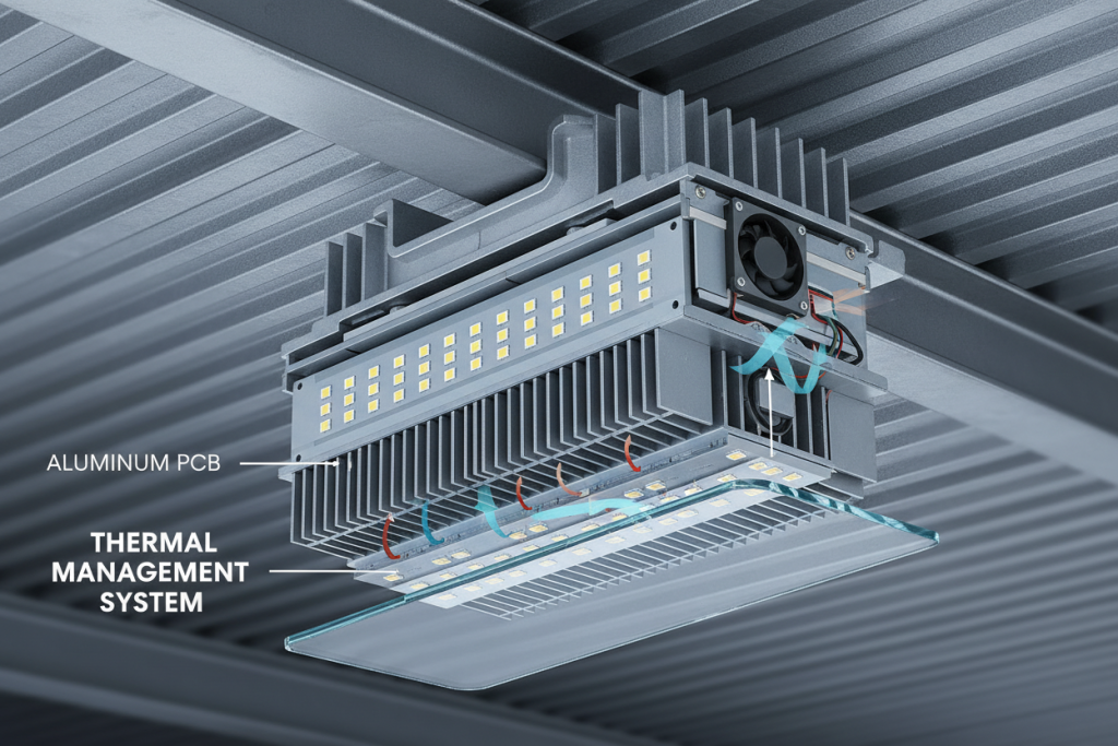 A commercial lighting manufacturer transitioned from single layer to double layer aluminum PCBs for 200W high-bay fixtures. Results demonstrated: