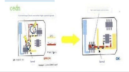 Check whether the length of the signal line and the frequency of the signal constitute resonance, that is, when the wiring length is an integer multiple of 1/4 of the signal wavelength, this wiring will resonate, and the resonance will radiate electromagnetic waves and cause interference. 8 Return path rules