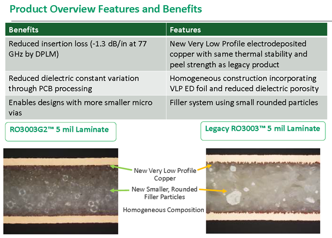 With the development of 79GHz frequency band (77-81GHz) radar sensors, they have wider signal bandwidth, which can further improve the resolution of radar sensors, increase the scanning angle, and even achieve 4D imaging. Based on RO3003TM material, Rogers Company developed and launched RO3003G2TM material to match the higher requirements of radar sensors for PCB material performance. Compared with RO3003TM material, RO3003G2TM has optimized a special filler system in the material system, reducing filler particles, improving the uniformity of the material system, and further reducing the dielectric constant tolerance between the entire board and batches; smaller and The uniform filler system also enables smaller via designs during PCB processing; the RO3003G2TM material uses smoother copper foil, which reduces the insertion loss in the circuit, and its performance is very close to the rolled copper insertion loss performance of RO3003TM.