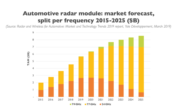 Relatively speaking, 77GHz radar has broad prospects, and its great advantages are high accuracy, high resolution, and excellent scalability from short to long distances. The two frequency bands of 77GHz radar are 76-77GHz and 77-81GHz, with bandwidths of 1GHz and 4GHz respectively. The huge bandwidth advantage significantly improves resolution and accuracy. On the other hand, due to the high frequency and short wavelength of 77GHz radar, components such as radar transceivers or antennas are designed to be smaller, thereby reducing the overall size of the radar and making it easy to install and hide in the car body. The 77GHz band has gained significant traction both in terms of global regulatory and industry adoption.