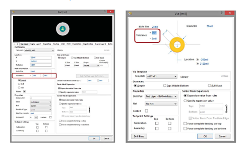 In the Via Properties dialog, edit the hole tolerance under Tolerance in the upper left corner in Figure 2.