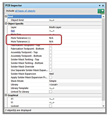 Open the PCB Inspector panel, as shown in Figure 3. Select the pad or via on the PCB you want to set, and enter the necessary hole tolerance value in the right column under the Object Specific panel.