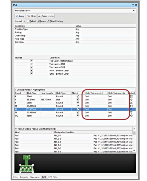 Figure 4 Multiple hole tolerance values can also be added in the PCB dialog box