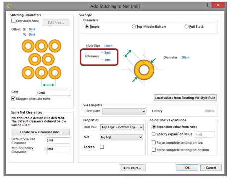 Figure 5 Add hole tolerances for through holes using the Add Stitching to Net panel