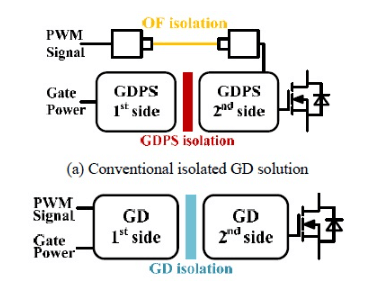 The typical configuration of an isolated gate driver (GD) for high voltage SiC MOSFET is shown in Figure 1 (a). An isolated gate drive power supply (GDPS) is required, and optical fiber (OF) is usually used to transmit the gate PWM signal to ensure sufficient isolation and low parasitic capacitance on the signal path [1], [5]. The disadvantages of this solution are the high cost of optical fiber and the need for at least two isolated power supplies.