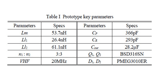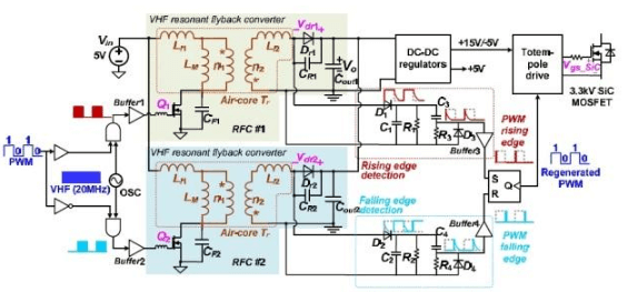 The maximum output power of the RFC is measured at 1.5W@17Ω resistive load, which is sufficient to drive a 3.3kV SiC MOSFET (GR40MT33N). The graph of efficiency and RFC output voltage (V O ) is shown in Figure 6. Both RFCs maintain stable output characteristics over the entire load range (0.12W-1.5W).
