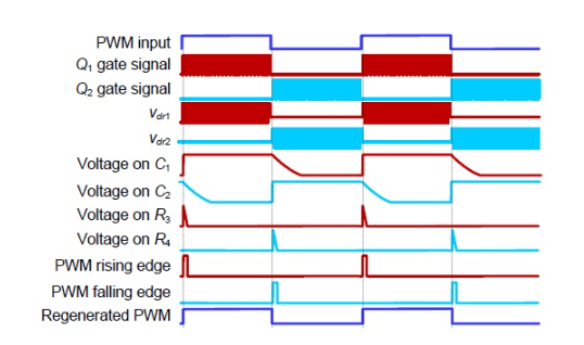 On the secondary side, two envelope detectors are connected to the anodes of diodes DR1 and DR2 to detect the ON/OFF state of the RFCs. These edge detection signals are then buffered as PWM rising and falling edges and sent to the RS bistable, which regenerates the PWM signal. The non-isolated DC-DC regulator connected after RFC 1 provides the required +5V, +15V, and -5V drive voltages for the secondary-side signal processing circuit.