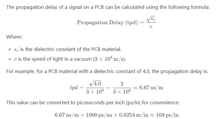 Propagation delay is the time it takes for an electrical signal to travel from the transmitter to the receiver along a transmission line on a PCB. It is typically measured in picoseconds per inch (ps/in) or nanoseconds per meter (ns/m). Propagation delay is influenced by the physical properties of the PCB materials and the design of the transmission lines.