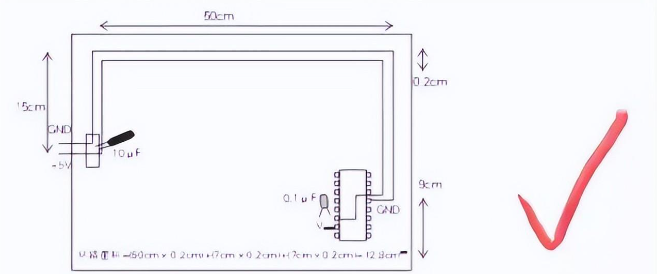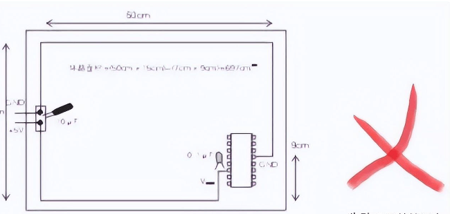 An example of PCB design with improper power line and ground line matching is shown in the figure. On this circuit board, different routes are used to lay the power line and ground line. Due to this improper matching, the electronic components and lines of the circuit board are more likely to be affected by electromagnetic interference (EMI).