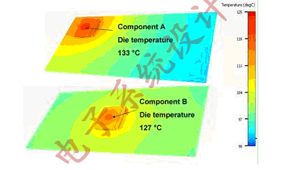 Figure 2 Effects of component layout on thermal performance. Components in the corners of the PCB have higher chip temperatures than components in the middle.