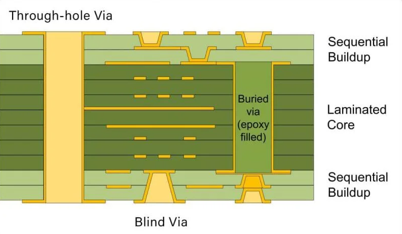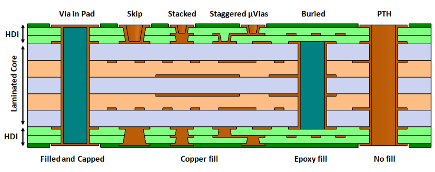 Filled vias: Vias completely filled with conductive material (copper or silver epoxy) for maximum current and thermal capacity