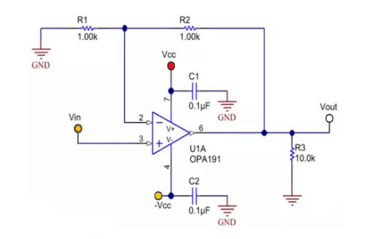 Recently, I worked with an intern on the OPA191 op amp in a non-inverting configuration with a gain of 2V/V, a load of 10kΩ, and a supply voltage of +/-15V. Figure 1 shows the schematic of the design.