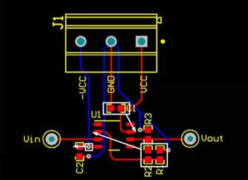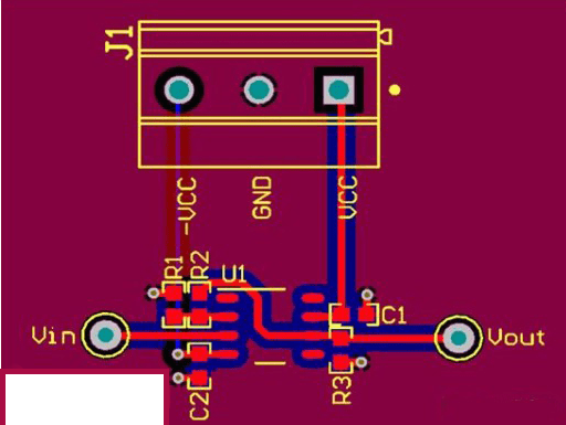 I asked the intern to layout the design, gave him general guidance on PCB layout (for example: minimize the trace path of the board, try to keep the components arranged closely to reduce the board space) ) space), and then let him design it himself. How difficult is the design process? It’s just a few resistors and capacitors, right? Figure 2 shows the layout of his initial attempt to design. The red line is the path to the top of the board, and the blue line is the path to the bottom.