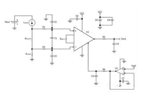 Figure 5 measures the differential voltage across RSHUNT, R1, R2, C1, C2, and C3 are used to provide common-mode and differential-mode filtering, R3 and C4 provide output filtering for U1 INA, and U2 is used to buffer the INA reference pin. R4 and C5 are used to form a low-pass filter to minimize the noise introduced by the op amp to the INA reference pin.
