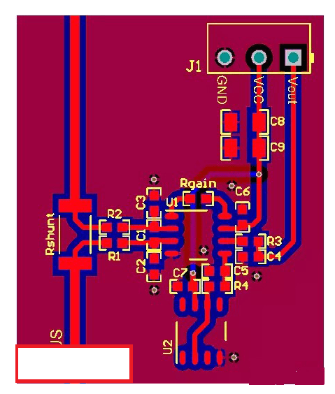 As can be seen in the above figure, the first error is measuring the differential voltage Rshunt across the resistor. It can be seen that the Rshunt to R2 line is shorter, so its resistance is less than the Rshunt to R1 line resistance. This difference in line impedance can induce input bias current into the INA, resulting in a differential voltage on the U1 input side. Since the INA’s job is to amplify the differential voltage, unbalanced lines on the input side can cause errors. Therefore, it is necessary to ensure that the INA input lines are balanced and as short as possible.